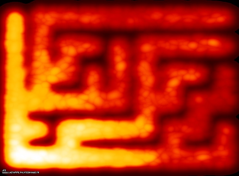 Particle diffusion inside the Hiroko Kitaoka model of the human pulmonary acinus with membrane permeability -display of the Oxygen density- [Diffusion de particules à l'intérieur du modèle de l'acinus pulmonaire humain dû à Hiroko Kitaoka avec perméabilité de la membrane -visualisation de la densité d'Oxygène-].