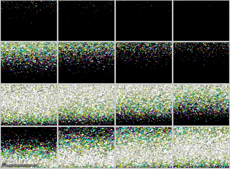 Visualization of sixteen density iso-surfaces (from density=0.01 to density=0.93) during a tridimensional diffusion process of 114299 particles [Visualisation de seize iso-surfaces de densité (de densité=0.01 à densité=0.93) pendant un processus de diffusion tridimensionnelle de 114299 particules]
