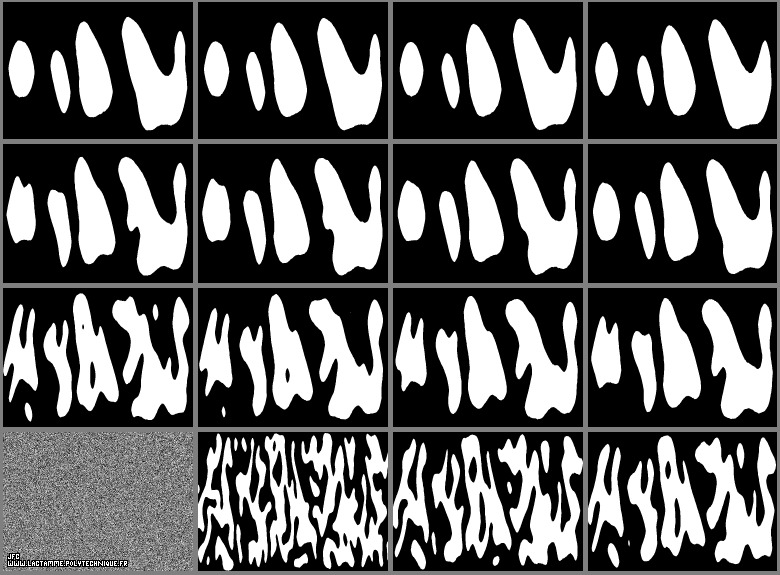 The bidimensional Ising Model with 2-state spins, temperature=0.2, a non-isotropic kernel and random initial conditions [Le modèle d'Ising bidimensionnel avec des spins à 2 états, température=0.2, un 'noyau' non isotrope et des conditions initiales aléatoires]