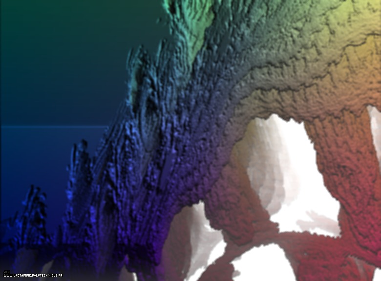 Close-up on a pseudo-quaternionic Mandelbrot set (a 'Mandelbulb') -tridimensional cross-section- [Agrandissement d'un ensemble de Mandelbrot dans l'ensemble des pseudo-quaternions (un 'Mandelbulb') -section tridimensionnelle-].