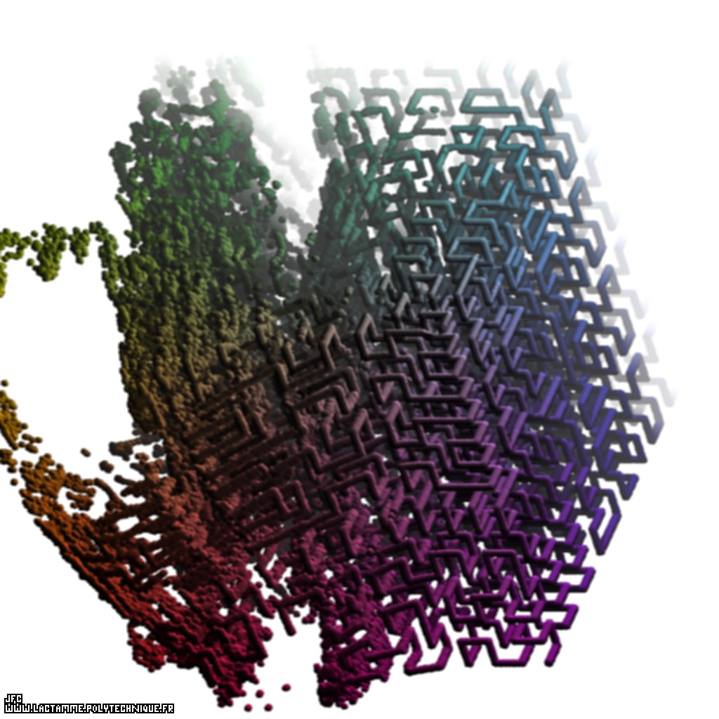 An interpolation between the tridimensional Hilbert Curve -iteration 4- and a detail of a pseudo-octonionic Mandelbrot set (a 'Mandelbulb') -tridimensional cross-section- [Une interpolation entre la courbe de Hilbert tridimensionnelle -itération 4- et un détail d'un ensemble de Mandelbrot dans l'ensemble des pseudo-octonions (un 'Mandelbulb') -section tridimensionnelle-].