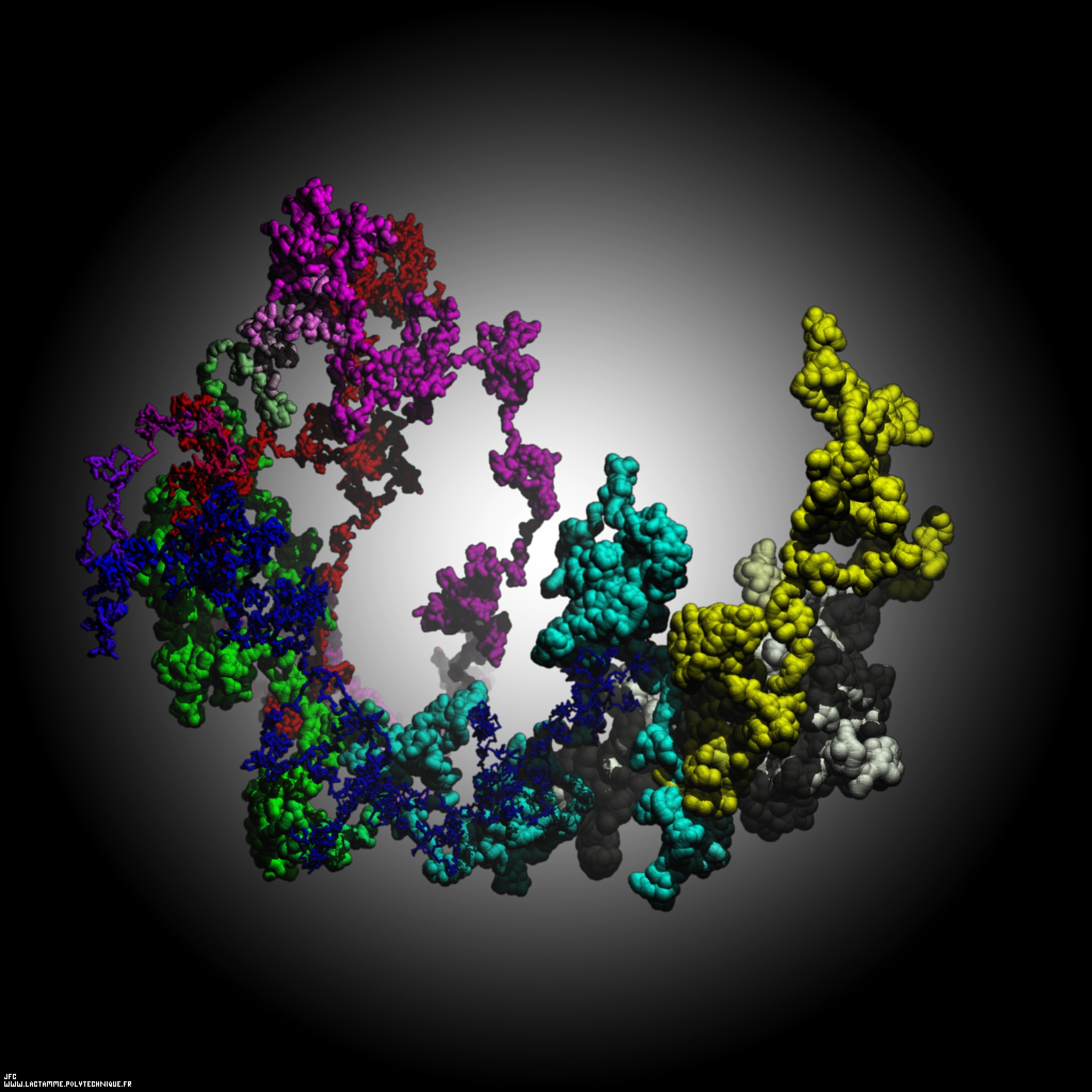 A tridimensional pseudo-random walk -cartesian coordinates- defined by means of the 99.999 first decimals of 'pi+e' (859874...) -base 10- with 33.333 time steps [Une pseudo-marche aléatoire tridimensionnelle -coordonnées cartésiennes- définie à l'aide des 99.999 premières décimales de pi+e (859874...) -base 10- avec 33.333 pas de temps].