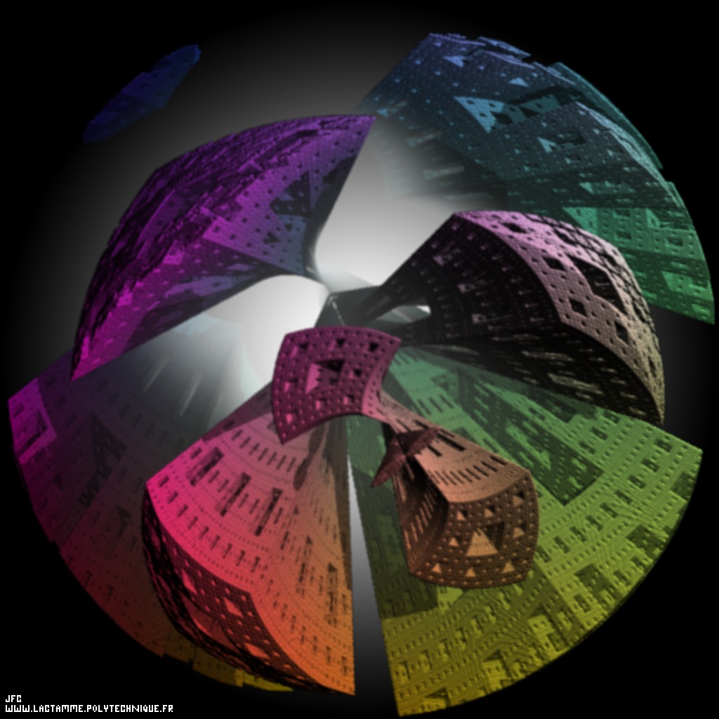 A tridimensional intertwining made of the Menger Sponge -iteration 5- inside a sphere [Un entrelacs tridimensionnel fait de l'éponge de Menger -itération 5- à l'intérieur d'une sphère].