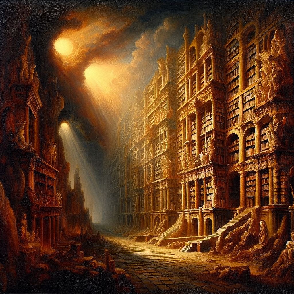 The Library of Babel in the style of Rembrandt -Courtesy of 'www.bing.com'- [La bibliothèque de Babel à la façon de Rembrandt -Remerciements à 'www.bing.com'-].