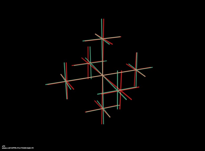 Anaglyph -blue=right, red=left- of a tridimensional fractal cross -iteration 2- [Anaglyphe -bleu=droite, rouge=gauche- d'un croix fractale tridimensionnelle -itération 2-].