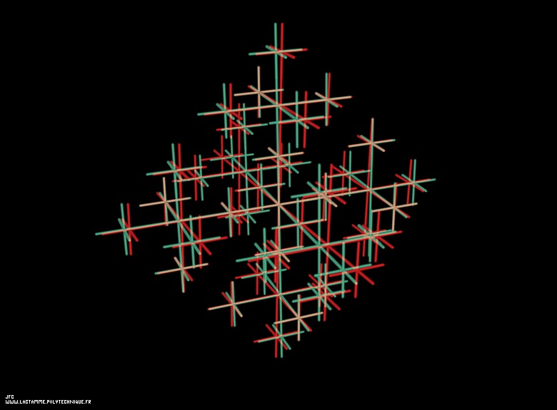 Anaglyph -blue=right, red=left- of a tridimensional fractal cross -iteration 3- [Anaglyphe -bleu=droite, rouge=gauche- d'un croix fractale tridimensionnelle -itération 3-].