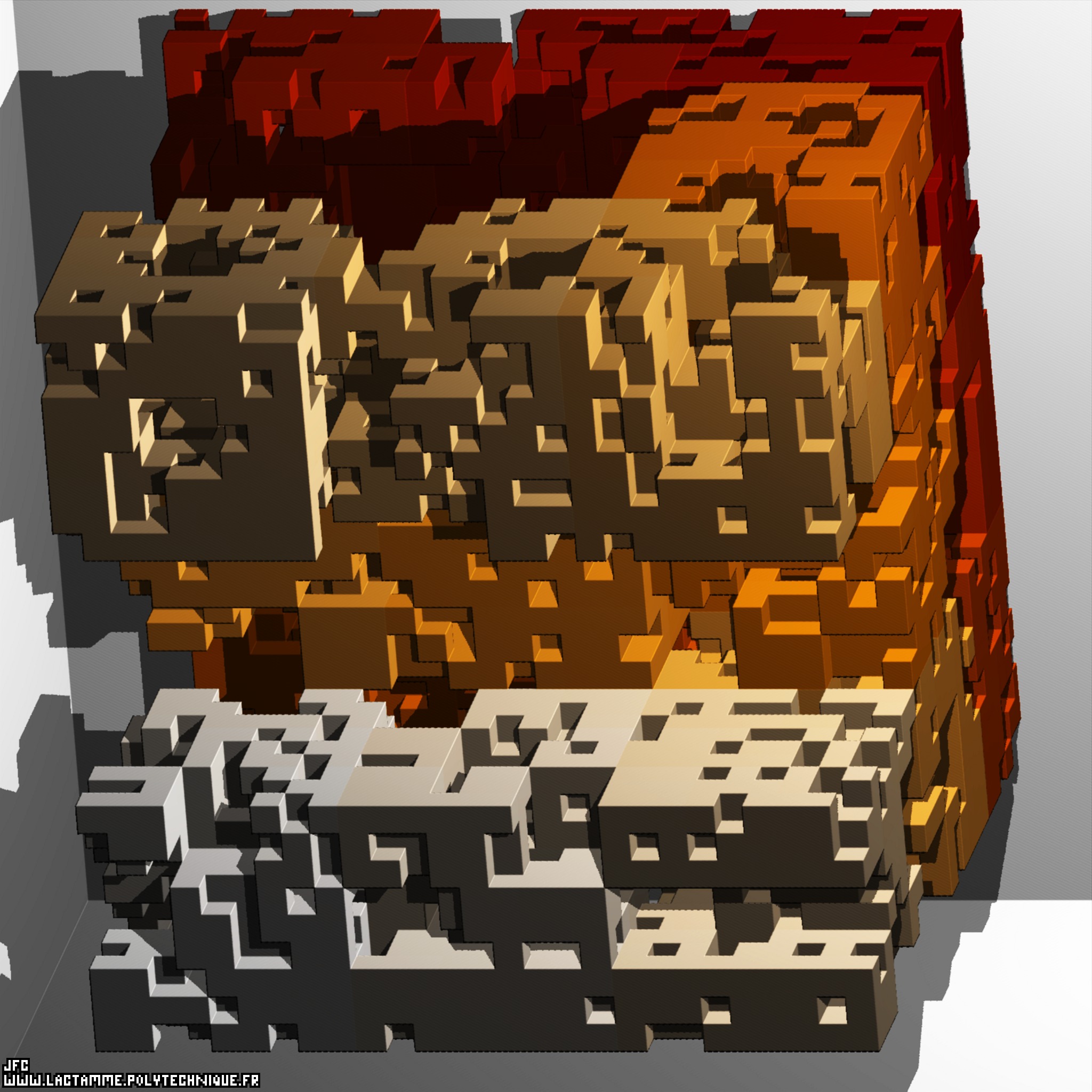An extended Menger Sponge -iteration 3- displaying the 10.665 first values of G(Pi(x)) modulo 2 of the Proth-Gilbreath conjecture [Une éponge de Menger généralisée -itération 3- visualisant les 10.665 premières valeurs de G(Pi(x)) modulo 2 de la conjecture de Proth-Gilbreath].
