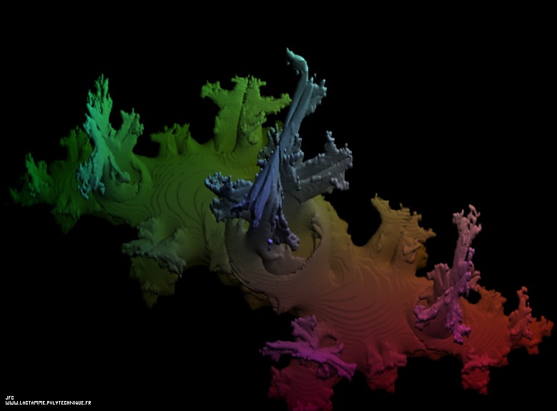 A pseudo-quaternionic Julia set ('MandelBulb' like: a 'JuliaBulb') computed with A=(-0.581514...,+0.635888...,0,0) -tridimensional cross-section- [Un ensemble de Julia dans l'ensemble des pseudo-quaternions (comme un 'MandelBulb': un 'JuliaBulb') calculé pour A=(-0.581514...,+0.635888...,0,0) -section tridimensionnelle-].