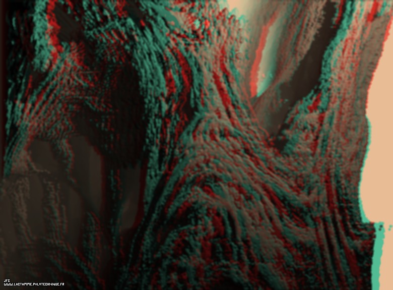 Anaglyph of a close-up on a pseudo-octonionic Mandelbrot set (a 'Mandelbulb') -tridimensional cross-section- [Anaglyphe d'un agrandissement d'un ensemble de Mandelbrot dans l'ensemble des pseudo-octonions (un 'Mandelbulb') -section tridimensionnelle-].