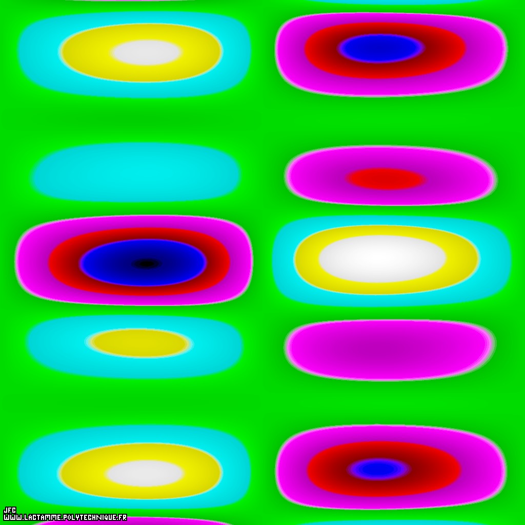 The bidimensional field defining the 'X' coordinate of a mixing -multiplication- of a sphere and of a 'thick' helix [Le champ bidimensionnel définissant la coordonnée 'X' du mélange -multiplication- d'une sphère et d'une hélice 'épaissie'].