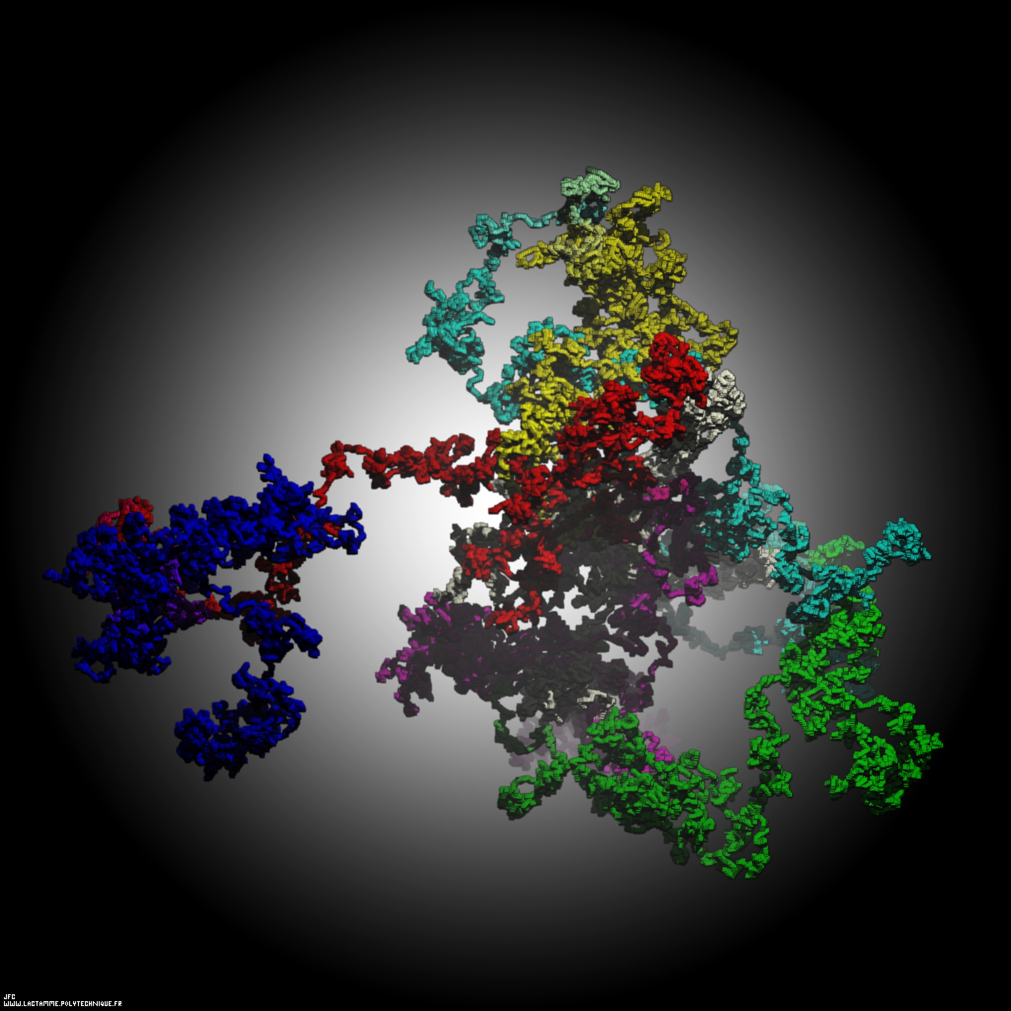 A tridimensional pseudo-random walk -cartesian coordinates- defined by means of the 99.999 first decimals of 'pi' (141592...) -base 10- with 33.333 time steps [Une pseudo-marche aléatoire tridimensionnelle -coordonnées cartésiennes- définie à l'aide des 99.999 premières décimales de 'pi' (141592...) -base 10- avec 33.333 pas de temps].