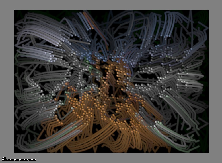 The trajectories of bidimensional fractal aggregates obtained by means of a 100% pasting process during collisions of particles submitted to an attractive central field of gravity [Les trajectoires des particules d'agrégats fractals bidimensionnels obtenus par collage de 100% de celles-ci lors de leurs collisions, dans un champ de gravitation central attractif].