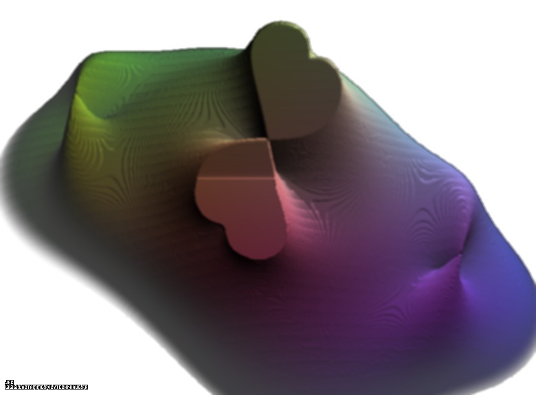 A pseudo-quaternionic Julia set ('MandelBulb' like : a 'JuliaBulb') computed with A=(-0.58...,+0.63...,0,0) with 4 iterations -tridimensional cross-section- [Un ensemble de Julia dans l'ensemble des pseudo-quaternions (comme un 'MandelBulb' : un 'JuliaBulb') calculé pour A=(-0.58...,+0.63...,0,0) avec 4 itérations -section tridimensionnelle-].