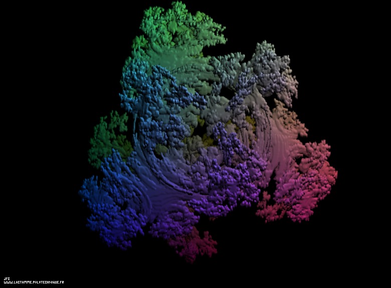 A pseudo-quaternionic Julia set ('MandelBulb' like : a 'JuliaBulb') computed with A=(-0.58...,+0.63...,0,0) -tridimensional cross-section- [Un ensemble de Julia dans l'ensemble des pseudo-quaternions (comme un 'MandelBulb' : un 'JuliaBulb') calculé pour A=(-0.58...,+0.63...,0,0) -section tridimensionnelle-].