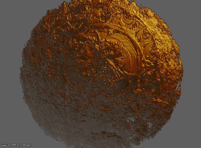 Artistic view of a pseudo-quaternionic Julia set ('MandelBulb' like : a 'JuliaBulb') computed with A=(-0.58...,+0.63...,0,0) -tridimensional cross-section- [Vue artistique d'un ensemble de Julia dans l'ensemble des pseudo-quaternions (comme un 'MandelBulb' : un 'JuliaBulb') calculé pour A=(-0.58...,+0.63...,0,0) -section tridimensionnelle-].