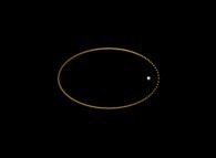 Elliptical trajectory of a planet around a star with perihelion advance (very exaggerated) [Trajectoire elliptique d'une planète autour d'une étoile avec avance de périhélie (très exagérée)].