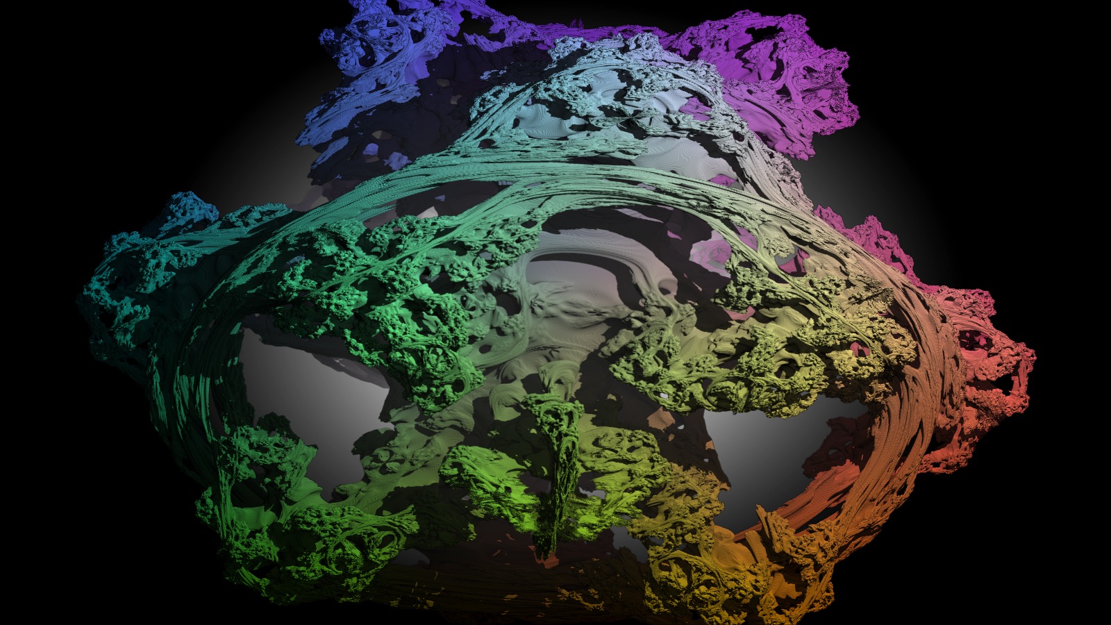 A foggy pseudo-octonionic Julia set ('MandelBulb' like: a 'JuliaBulb') computed with A=(-0.581514...,+0.635888...,0,0,0,0,0,0) and with a rotation about the X axis -tridimensional cross-section- [Section tridimensionnelle dans un ensemble de Julia calculé dans les octonions en utilisant une arithmétique spéciale].