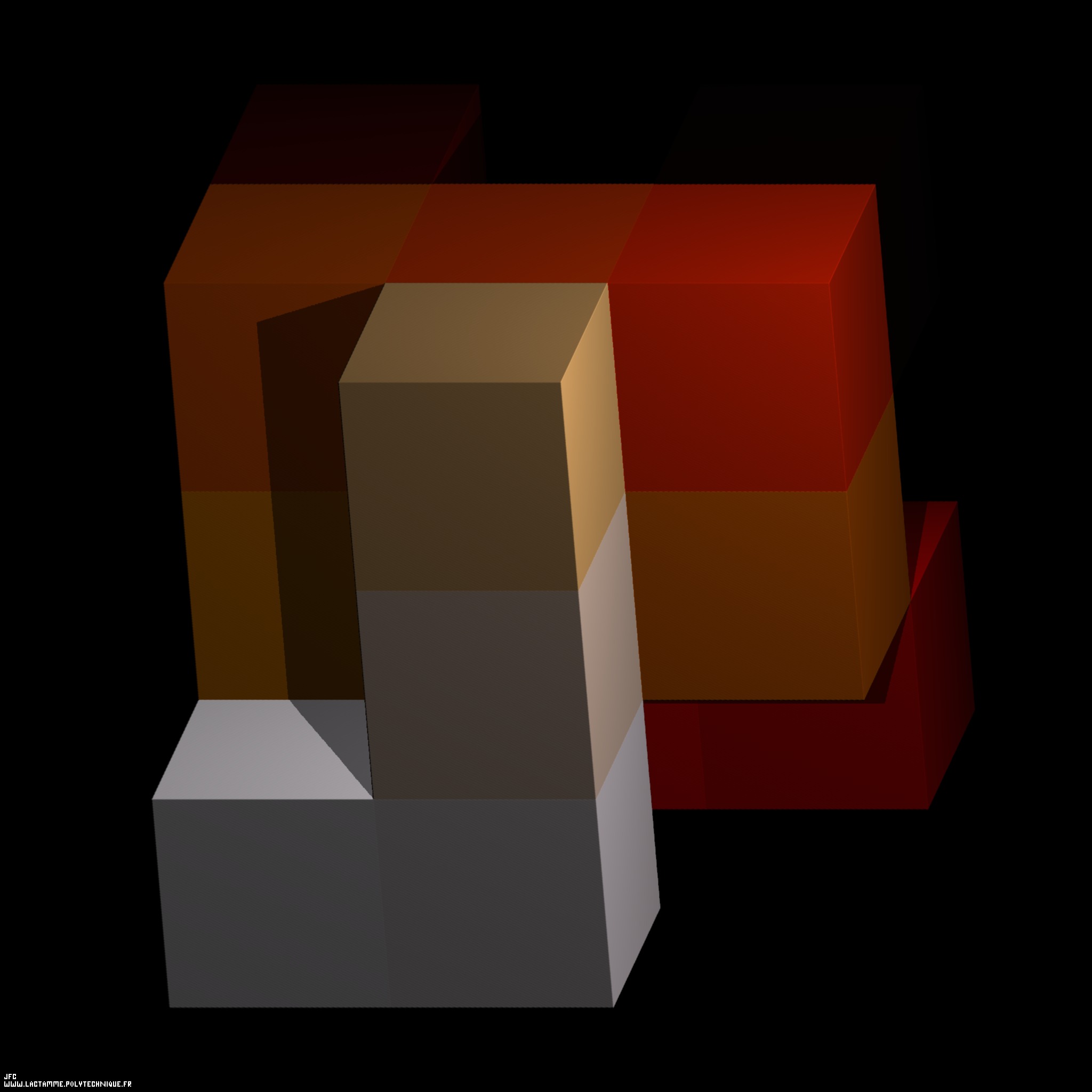 An extended Menger Sponge -iteration 1- displaying the 27 first digits -base 2- of 'pi' [Une éponge de Menger généralisée -itération 1- visualisant les 27 premiers chiffres -base 2- de 'pi'].