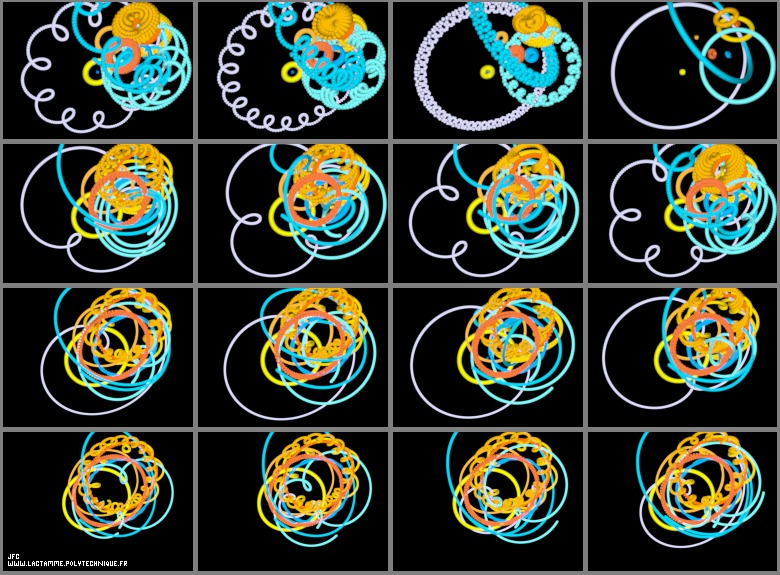 The journey of a sphere (dark blue) in a system of pure uniform non concentric circular motions -moving point of view (dark blue)- [Le voyage d'une sphère (bleue sombre) dans un système de purs mouvements circulaires uniformes -point de vue de la sphère (bleue sombre) en mouvement-]