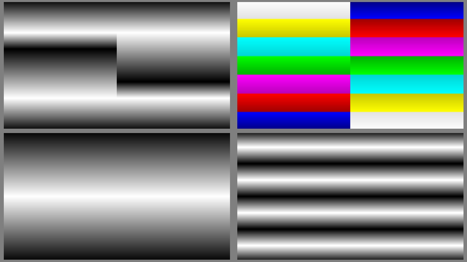 The same bidimensional scalar field displayed with 4 different color palettes [Les objets mathématiques et les nombres en particulier n'ont pas de couleurs. Malheureusement pour les présenter sous forme d'images, il faut malgré tout leur en attribuer et le choix qui est fait alors est arbitraire. Ces quatre images visualisent la même matrice mais avec des conventions différentes ce qui conduit à des représentations incompatibles entre-elles].