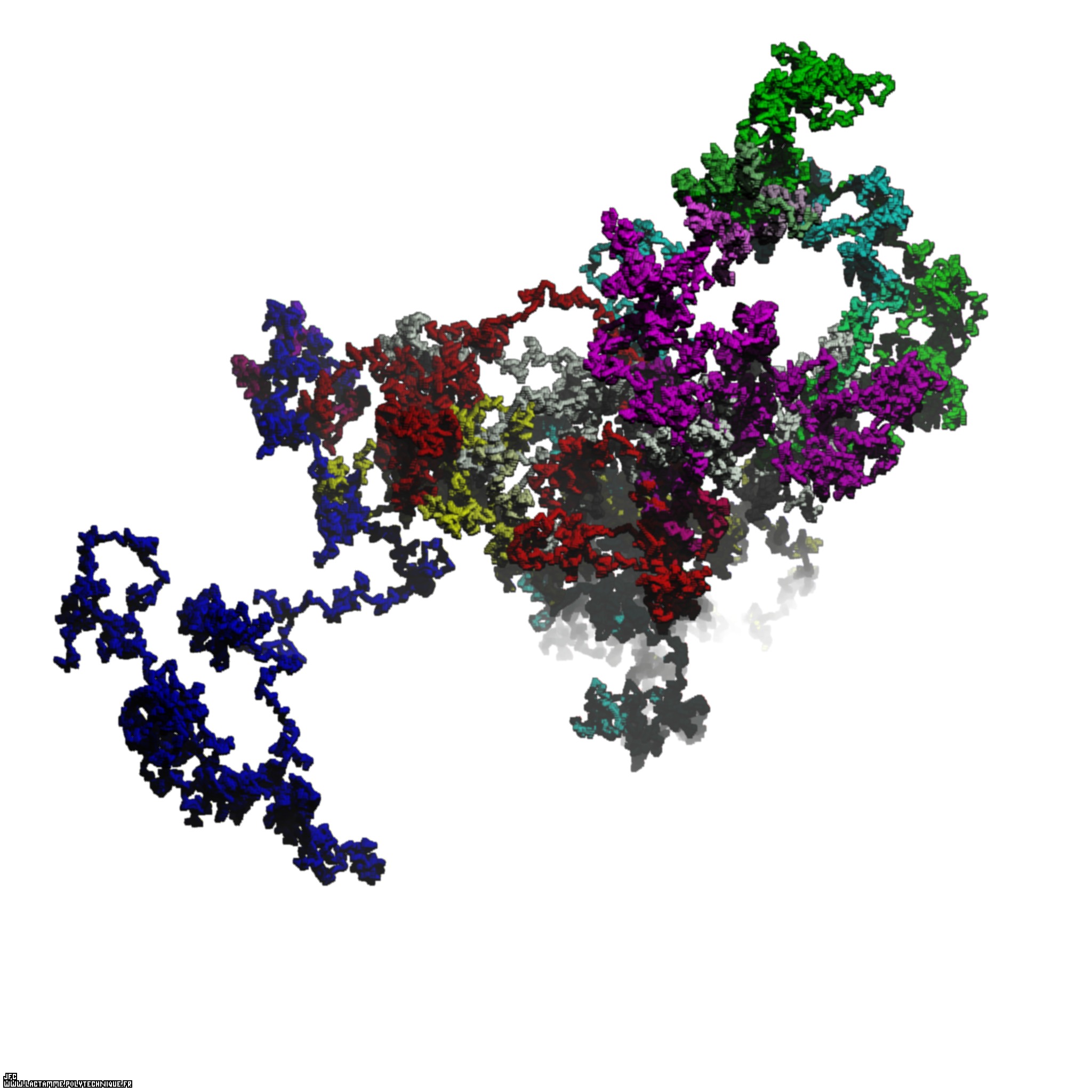 A tridimensional pseudo-random walk defined by means of 'pi': 3.141592... -90.000 digits, -base 10- with 30.000 time steps [Une pseudo-marche aléatoire tridimensionnelle définie à l'aide de 'pi': 3.141592... -90.000 chiffres, -base 10- avec 30.000 pas de temps].