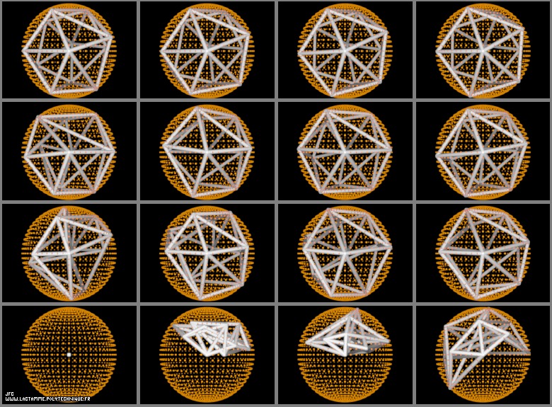 Dynamics of the even distribution of 12 points on a sphere -an Icosahedron- by means of simulated annealing [Dynamique du processus de répartition équitable de 12 points sur une sphère -un Icosaèdre- par recuit simulé]