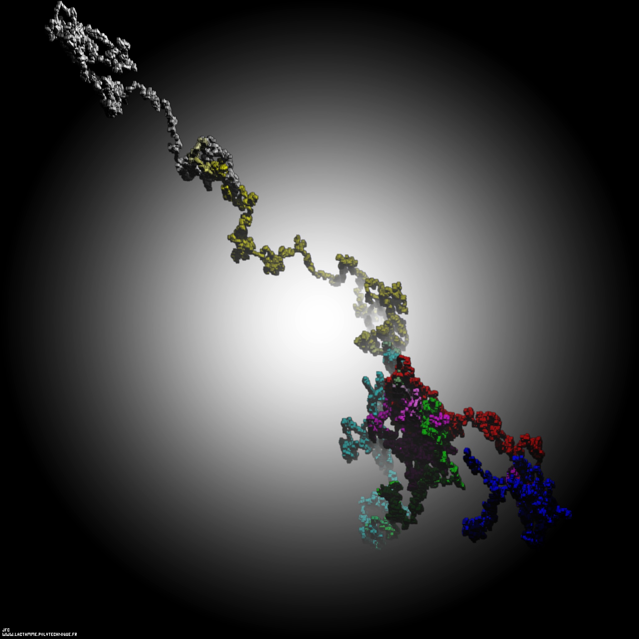 A tridimensional pseudo-random walk -spherical coordinates- defined by means of the 99.999 first decimals of an arbitrary random number (190496...) -base 10- with 33.333 time steps [Une pseudo-marche aléatoire tridimensionnelle -coordonnées sphériques- définie à l'aide des 99.999 premières décimales d'un nombre aléatoire arbitraire (190496...) -base 10- avec 33.333 pas de temps].