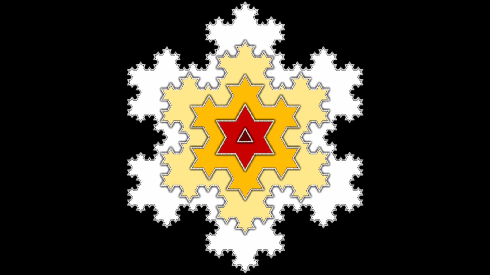 The first four iterations of the construction of the von Koch snowflake [Le flocon de von Koch s'obtient en partant d'un triangle équilatéral. Chacun de ses côtés est remplacé par une figure faite de quatre segments trois fois plus petits. Ce processus est ensuite itéré indéfiniment (4 fois sur cette image).]