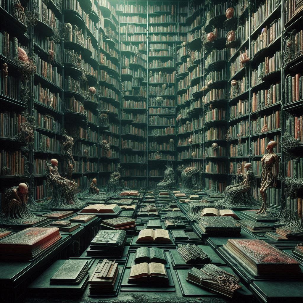 The Library of Babel in the style of Hans Ruedi Giger -Courtesy of 'designer.microsoft.com'- [La bibliothèque de Babel à la façon de Hans Ruedi Giger -Remerciements à 'designer.microsoft.com'-].