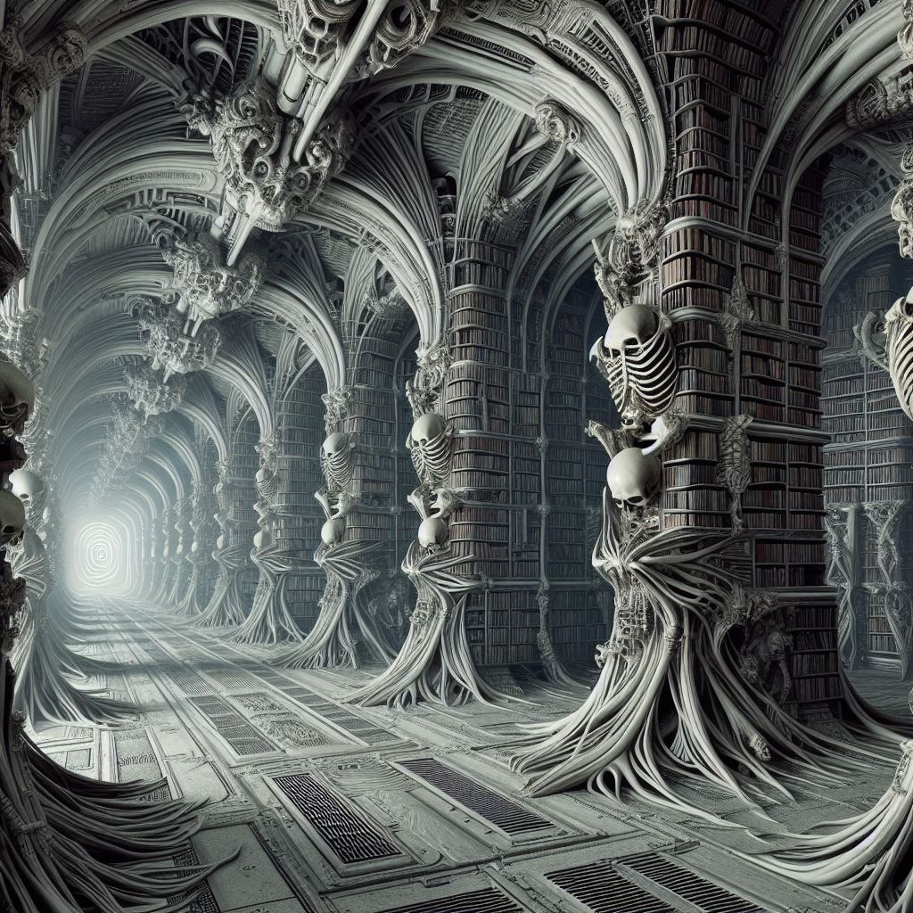The Library of Babel in the style of Hans Ruedi Giger -Courtesy of 'www.bing.com'- [La bibliothèque de Babel à la façon de Hans Ruedi Giger -Remerciements à 'www.bing.com'-].