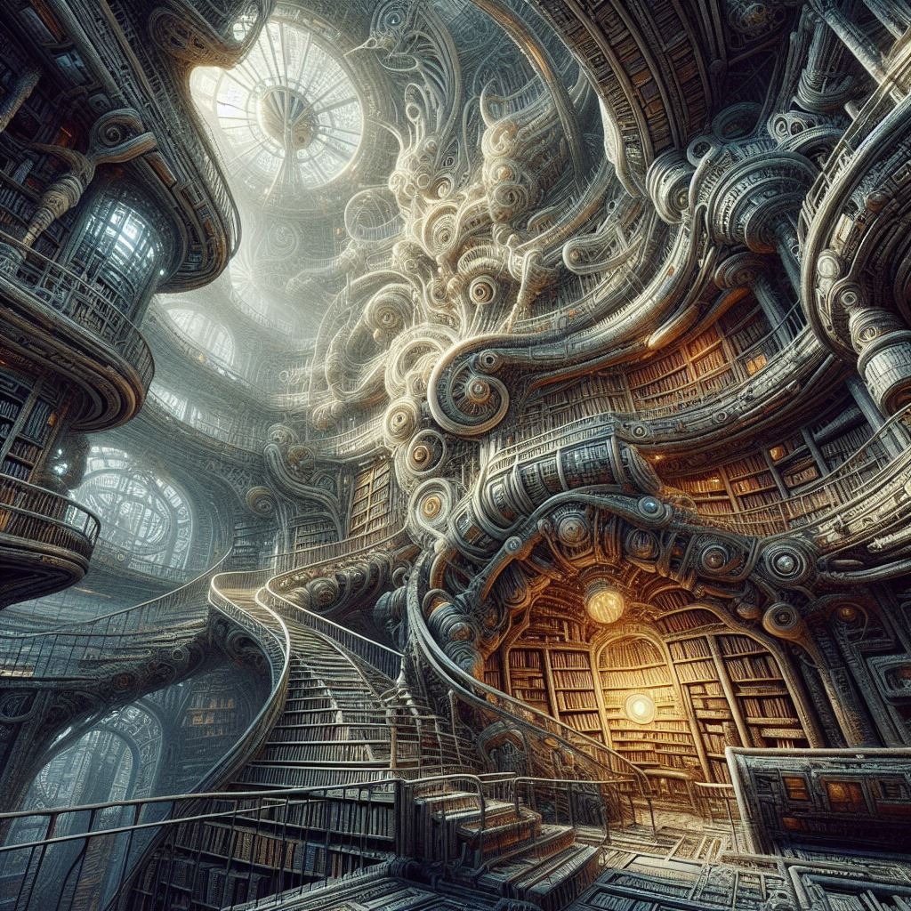 The Library of Babel in the style of Hans Ruedi Giger -Courtesy of 'www.bing.com'- [La bibliothèque de Babel à la façon de Hans Ruedi Giger -Remerciements à 'www.bing.com'-].