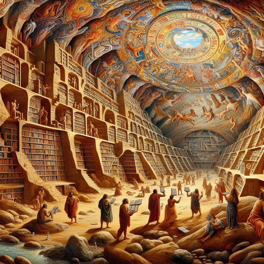 The Library of Babel in the style of the cave of Lascaux -Courtesy of 'www.bing.com'- [La bibliothèque de Babel à la façon de la grotte de Lascaux -Remerciements à 'www.bing.com'-].