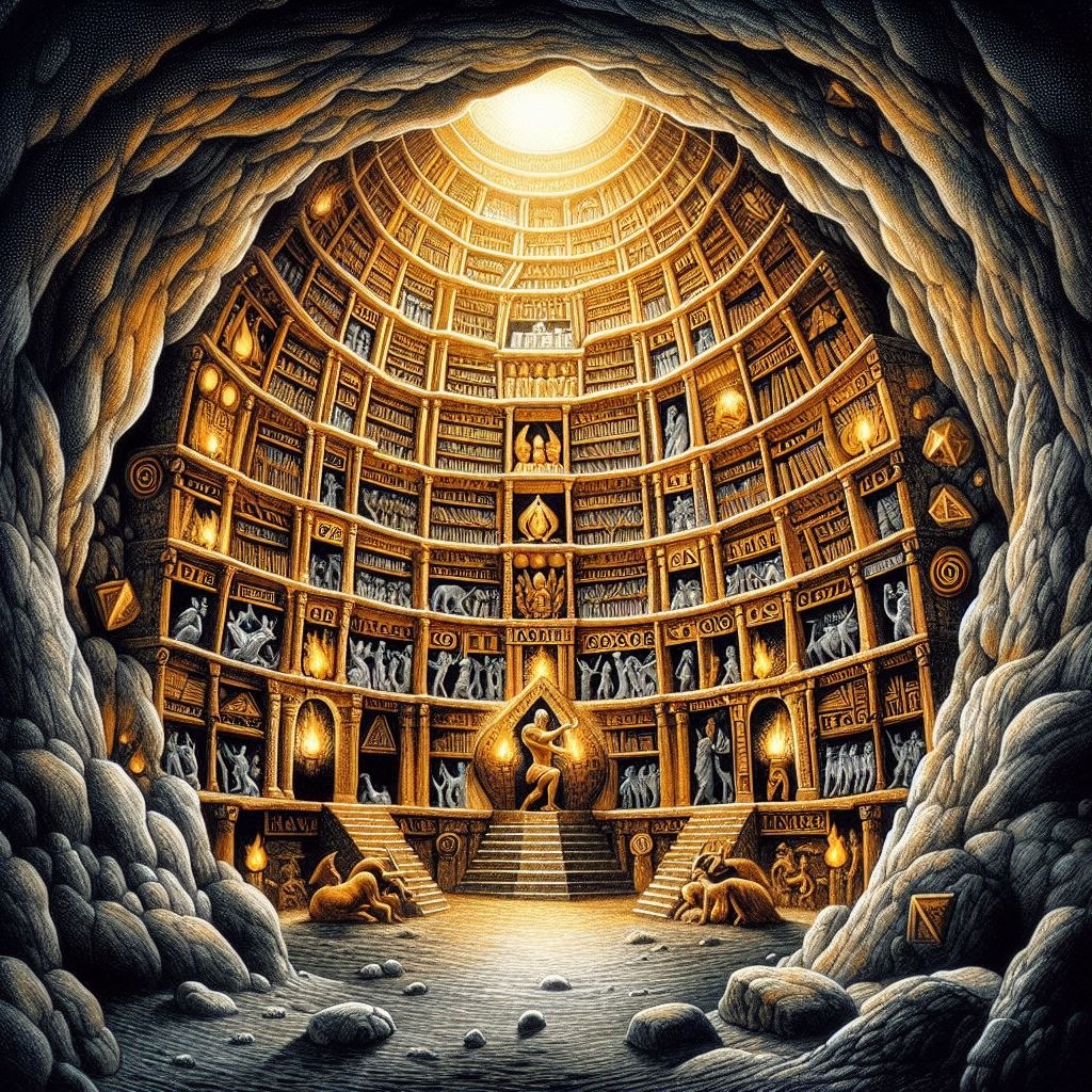 The Library of Babel in the style of the cave of Lascaux -Courtesy of 'www.bing.com'- [La bibliothèque de Babel à la façon de la grotte de Lascaux -Remerciements à 'www.bing.com'-].