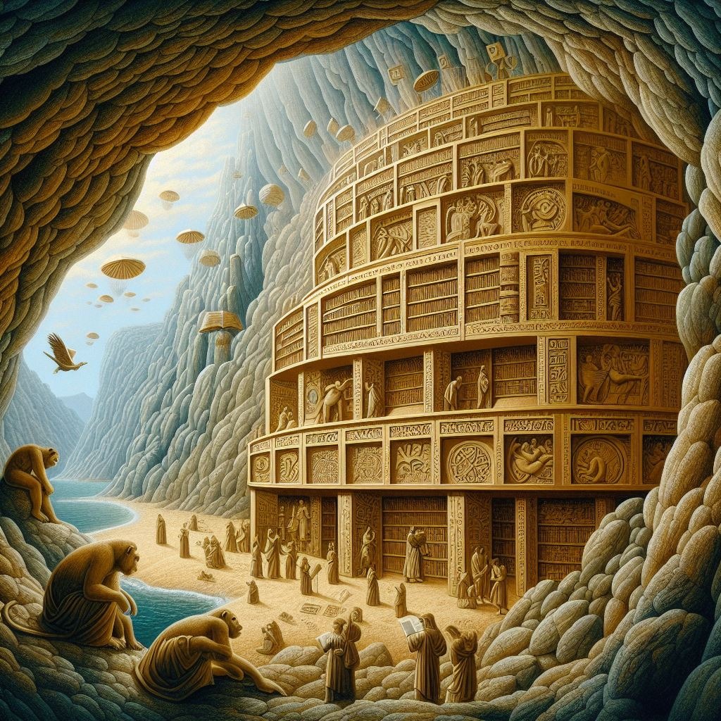 The Library of Babel in the style of the cave of Lascaux -Courtesy of 'www.bing.com'- [La bibliothèque de Babel à la façon de la grotte de Lascaux -Remerciements à 'www.bing.com'-].