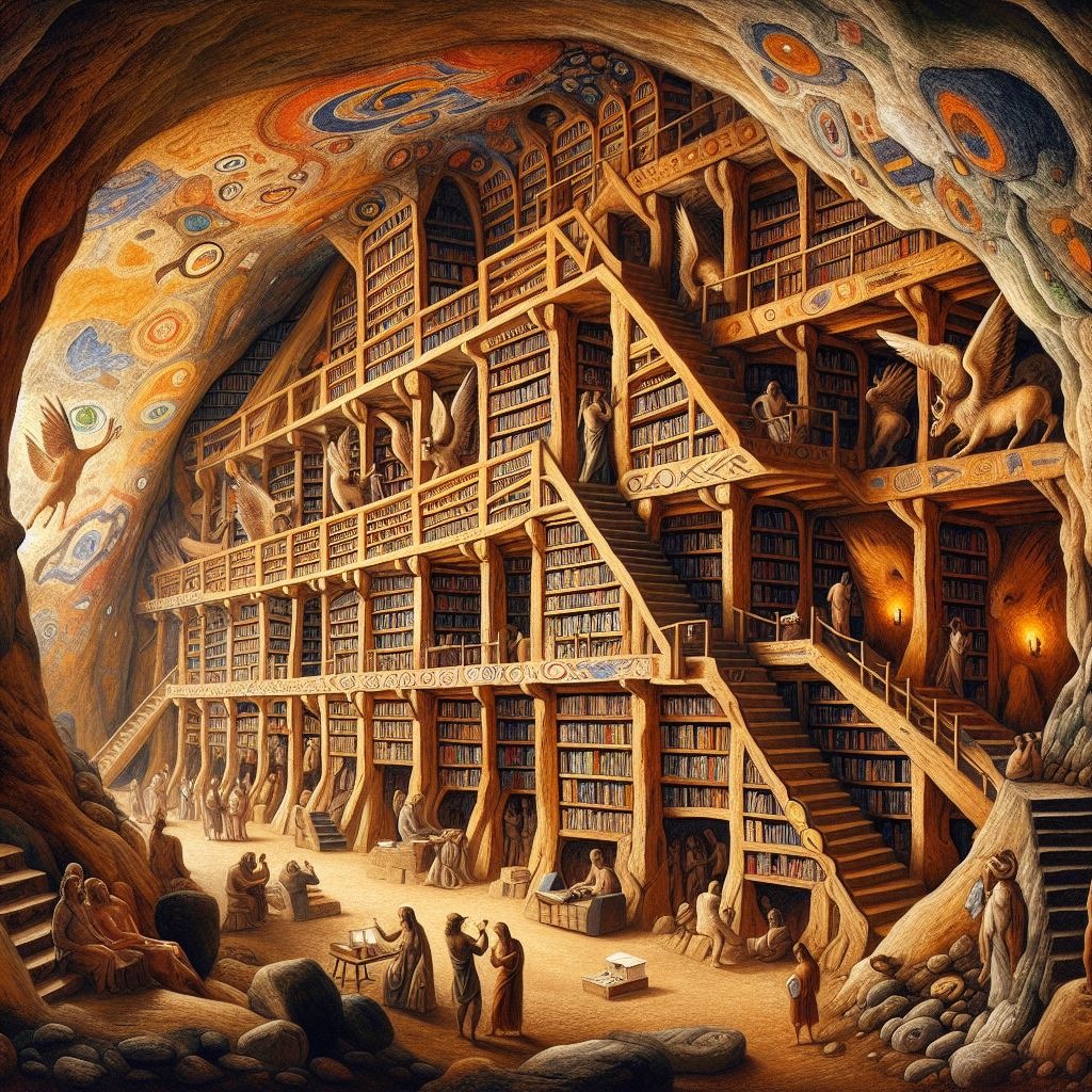 The Library of Babel in the style of the cave of Lascaux -Courtesy of 'www.bing.com'- [La bibliothèque de Babel à la façon de la grotte de Lascaux -Remerciements à 'www.bing.com'-].