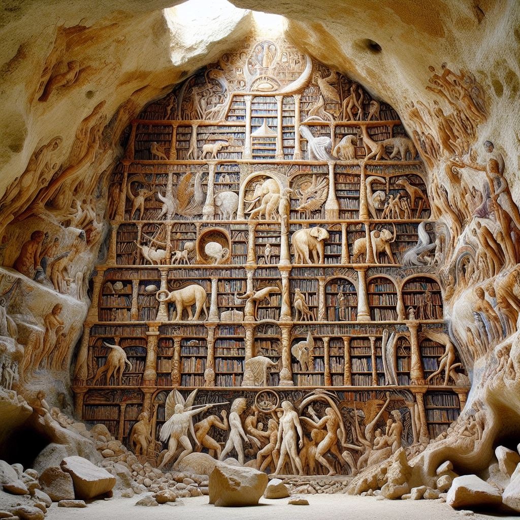 The Library of Babel in the style of the cave of Lascaux -Courtesy of 'www.bing.com'- [La bibliothèque de Babel à la façon de la grotte de Lascaux -Remerciements à 'www.bing.com'-].