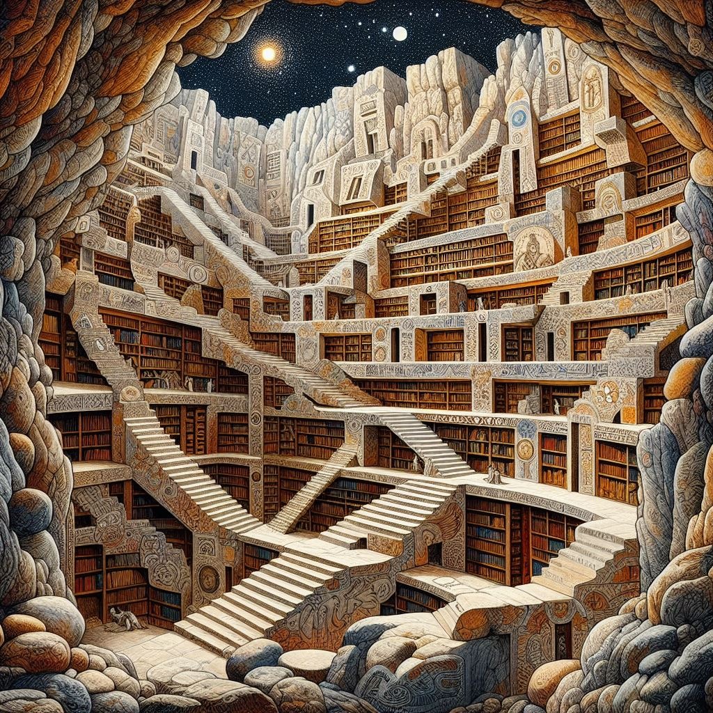 The Library of Babel in the style of the cave of Lascaux -Courtesy of 'www.bing.com'- [La bibliothèque de Babel à la façon de la grotte de Lascaux -Remerciements à 'www.bing.com'-].